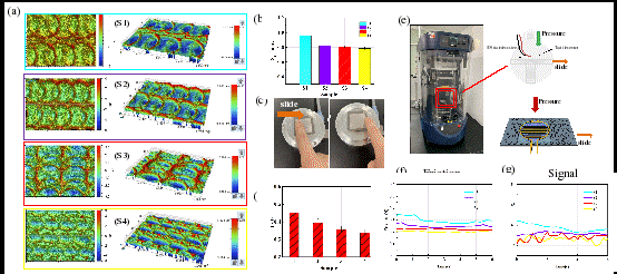 图2 a) 激光加工表面S1、S2、S3和S4的3D形貌;b) 激光加工表面S1、S2、S3和S4的平均粗糙度(Sa); c) 人体手指对不同粗糙度表面的触觉反应实验示意图; d)手指与不同表面作用下的平均摩擦系数; e) 实验装置示意图; f) 在1 N的压力载荷作用下,在不同表面粗糙度的激光加工表面滑动时的摩擦力曲线; g) 摩擦力作用下传感器的电阻变化。