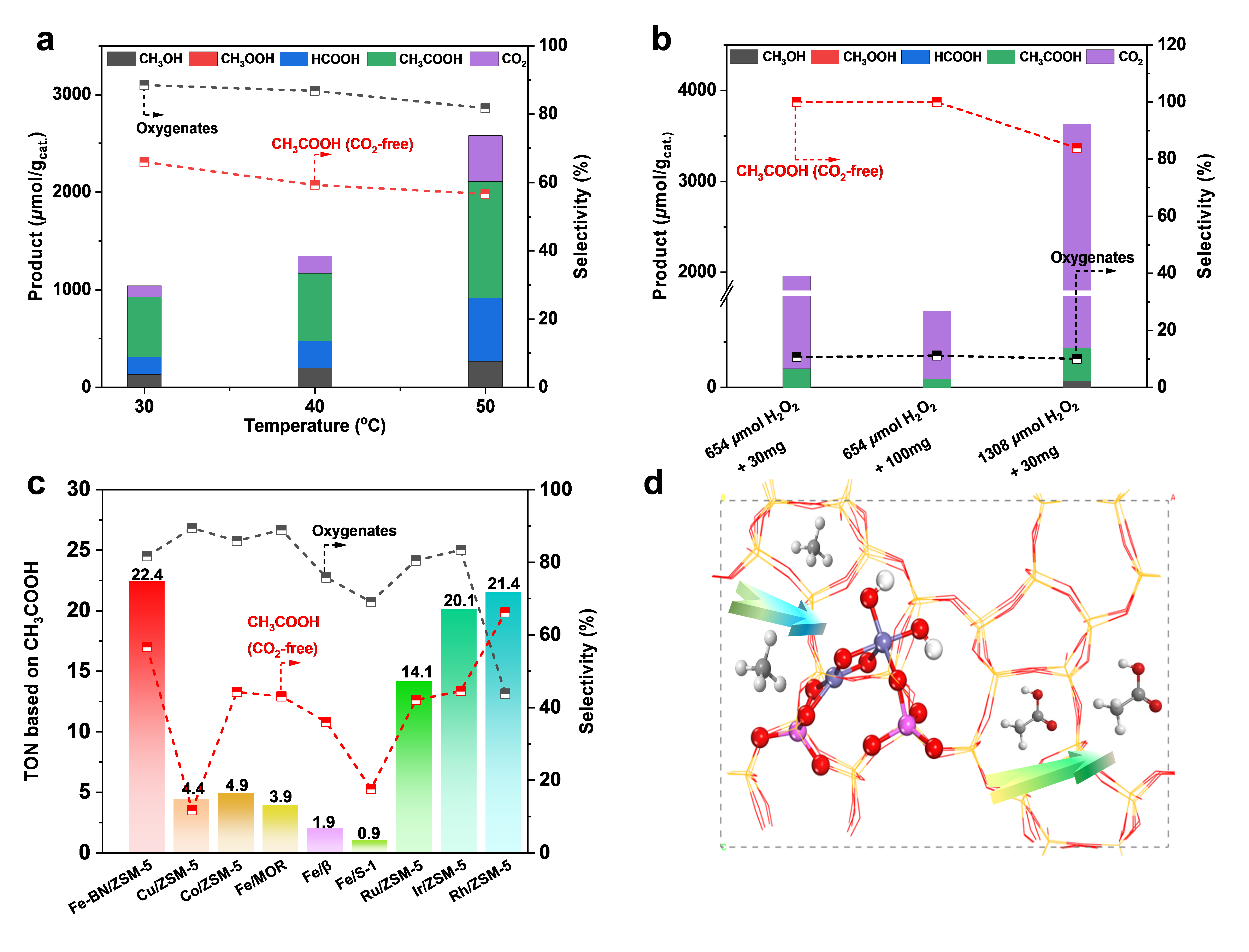 该研究工作构建了ZSM-5负载的二核Fe位点催化剂(Fe-BN/ZSM-5)并用于CH4直接转化制备CH3COOH。采用多种先进表征如球差电镜(AC-HAADF-STEM)、X-射线吸收精细结构(XAFS)、紫外光谱(UV-vis)和拉曼光谱(Raman)证实了二核Fe位点([Fe(III)-(μO)2-Fe(III)-(OH)2])的结构。Fe-BN/ZSM-5催化剂在近室温条件下同时展现了超高的含氧产物总选择性和CH3COOH在含氧产物中的选择性(图1)。在一定条件下,Fe-BN/ZSM-5催化剂的CH3COOH生成速率甚至优于ZSM-5负载的Rh、Ir和Ru贵金属催化剂。在30°C下,含氧产物选择性高达89%,CH3COOH在含氧产物中的选择性高达66%。若不考虑生成的CO2,CH3COOH在含氧产物中的选择性可高达100%。