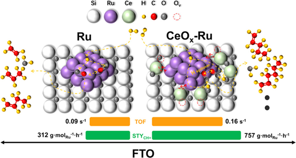 研究发现,合适的CeOx-Ru界面催化剂(0.1Ce/Ru)本征活性和烯烃时空收率较无Ce体系分别提升1.76和2.0倍,且同时保持~71%烯烃选择性与较低的CH4与CO2总选择性(<6%),催化稳定性超过200h,突破Ru基催化剂活性-烯烃选择性跷跷板关系束缚(图1)。机理研究表明,Ce 掺杂可顺利获得电子转移形成富电子 Ru 活性中心,强化 CO 吸附与解离;同时CeOx-Ru界面形成了H2活化与高效转移通道,提升了界面 H*反应活性、降低CO活化表观活化能,显著提高 Ru 原子利用效率。该工作表明,构筑金属-金属氧化物界面结构是开发高性能低负载钌基费托制烯烃催化剂的有效策略(图2)。