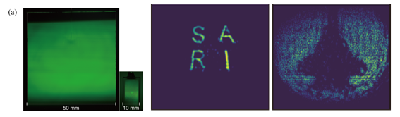 4. 扩大成像视场,有助于系统走向实用化:针对成像面积受限的问题,提出了一种基于大尺寸原子气室和均匀激光整形的优化策略,实现了50mm × 50mm的大视场太赫兹原子成像。该系统有效扩展了探测视场,提高原子荧光分布的空间均匀性,使太赫兹量子成像从以往的毫米尺度验证,迈向更接近实际应用需求的系统尺度。进一步将该系统已成功应用于液体混合过程的可视化监测,展现出在化学检测与生物扩散过程分析中的潜力。