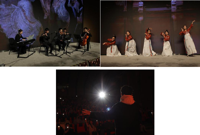 晚会第二乐章“碎玉 流云”在德米特里 肖斯塔科维奇的《第二圆舞曲》中缓缓开启,上科大管弦乐团的乔欣怡等五位同学带来的室内乐小重奏,以独特的音乐语言,勾画出了那个充满激情与挣扎的历史瞬间。上科大国风社民族舞团的同学们给我们带来美轮美奂的民族舞《云想衣裳花想容》,舞者们如云般飘逸的舞姿,如花般灿烂的笑颜,像是诗篇中的诗句,在我们眼前呈现出美妙动人的画面。高研院李元兴同学在观众摇曳的灯光中带来歌曲串烧《为你种花》,融合了五首精彩的歌曲,在跌宕起伏的旋律中表达了温柔细腻的情感,渲染了全场热情的氛围。